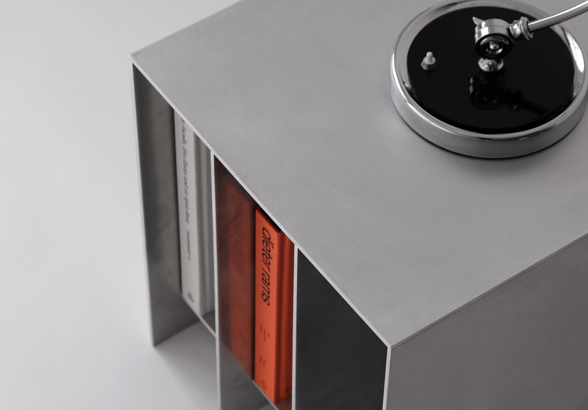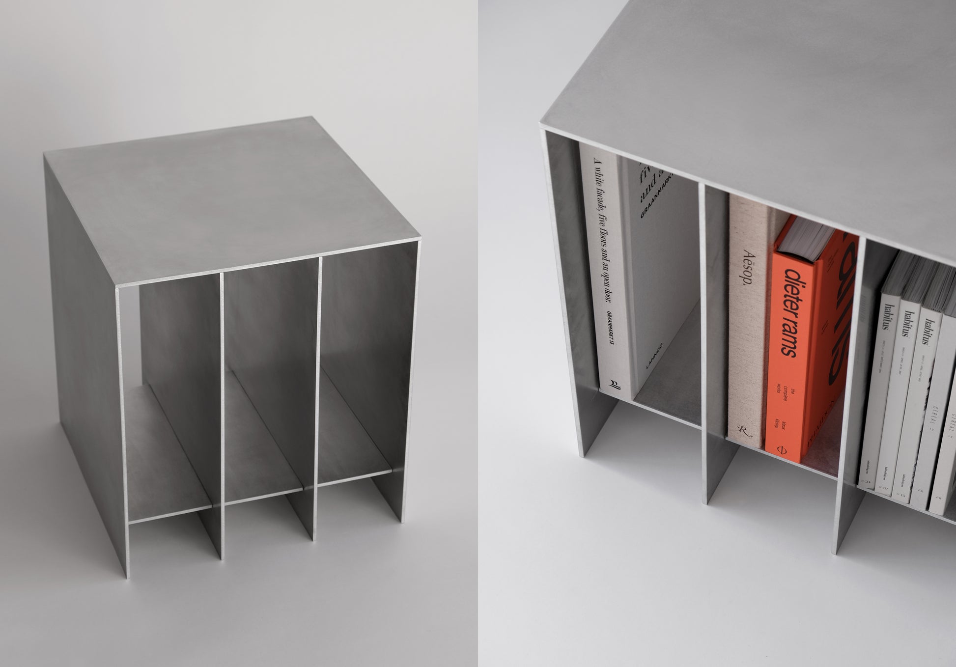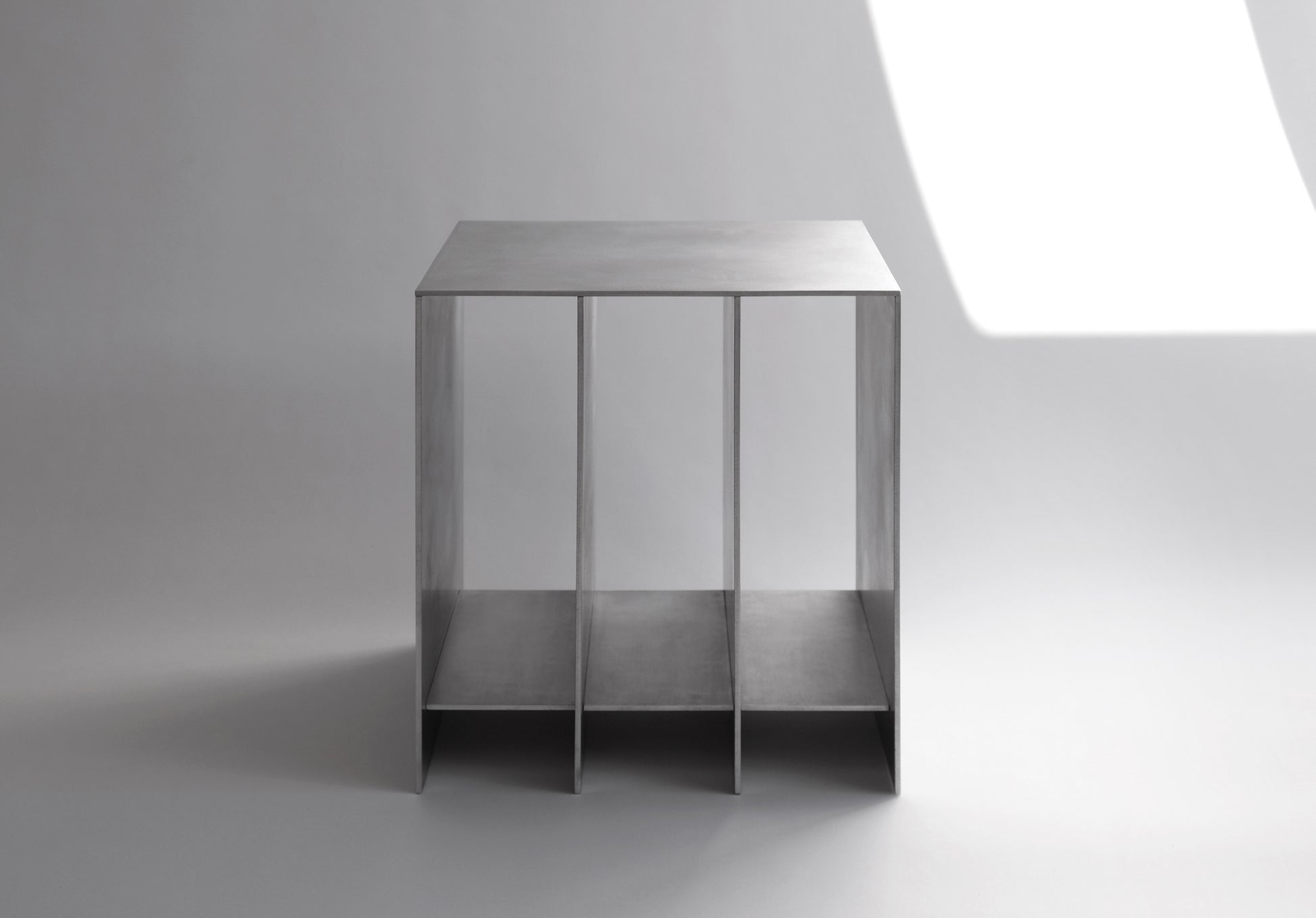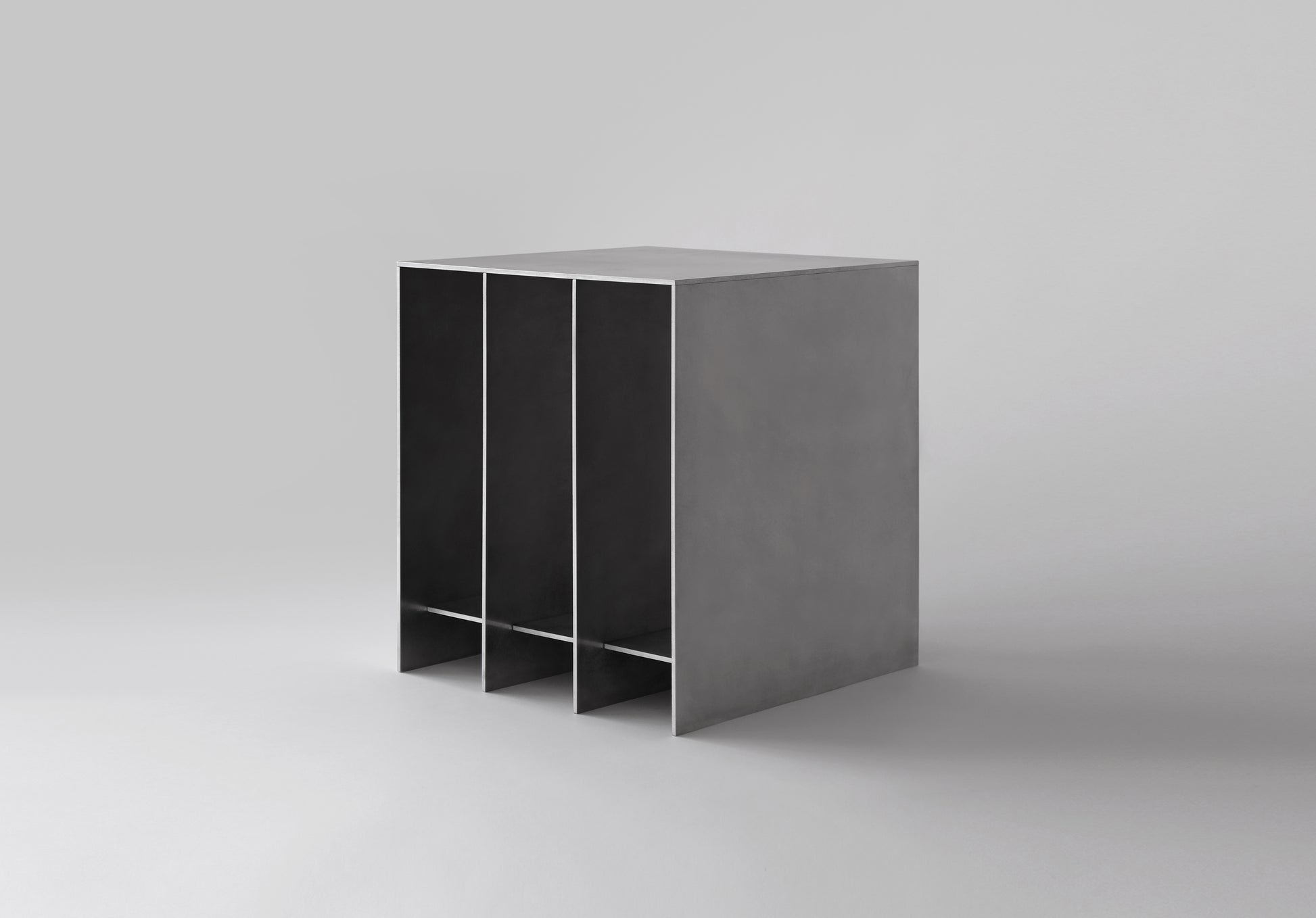 A side table designed to house and display objects while containing them within an orderly, clean, and mathematical framework. Vertical planes provide recessed nooks for neatly tucking books or loose items away, while bringing a sense of order and structure to any environment. Its sleek profile and thin members allow it to almost disappear from a front elevation, while the aluminium frame brings presence and grounding to living or bedroom spaces. Gently filleted edges and hand-finished surfacing ensure a soft interface, juxtaposing the hardness of the raw aluminium planes.