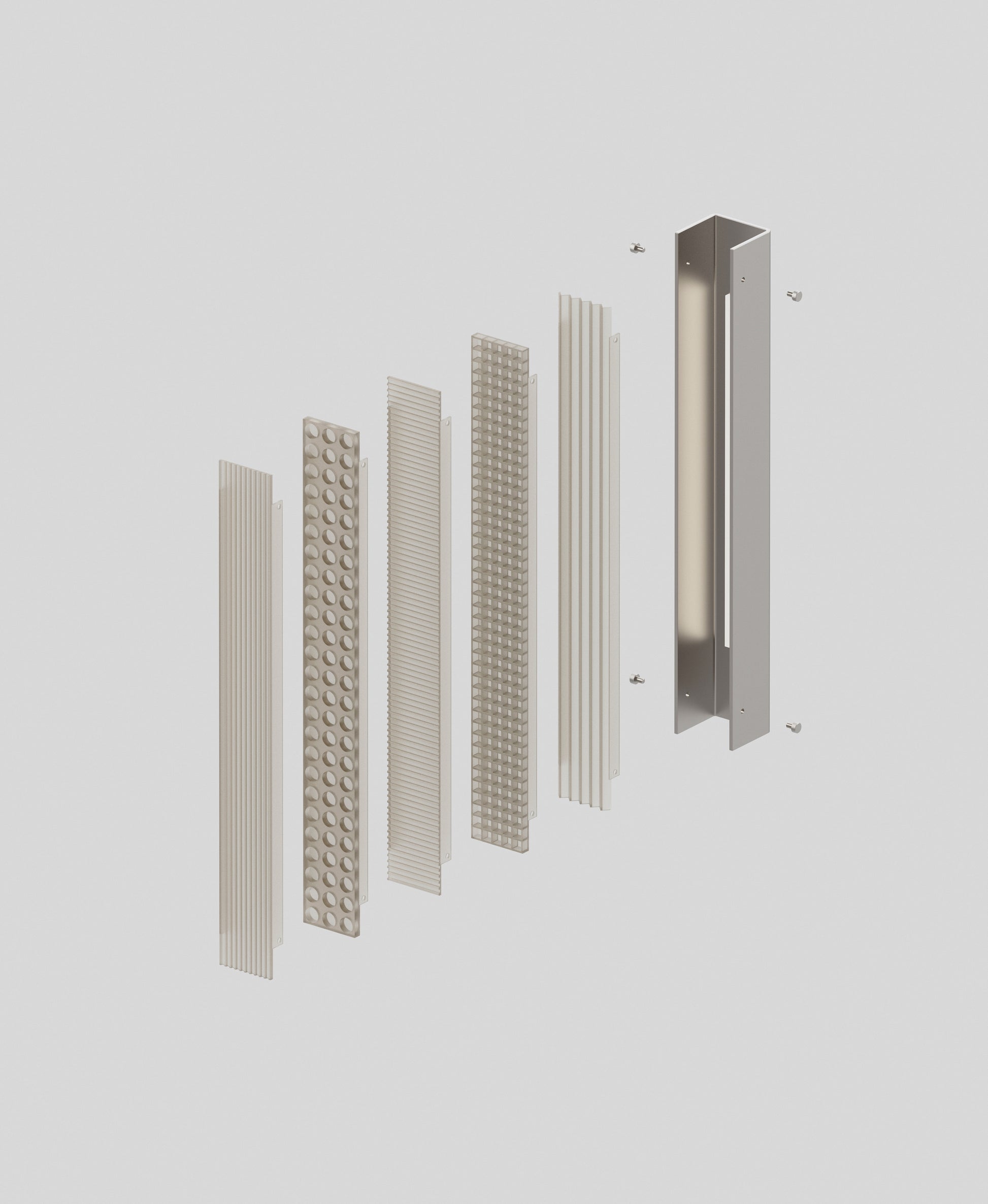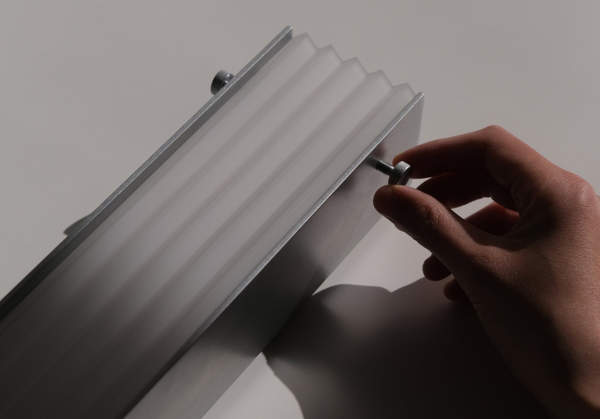 A modular wall light system which allows for interchangeable shade options. With the ability to change its shade indefinitely, the light can be adapted according to your desires, space, and needs over time. Each shade is made to order using the latest technology in small batch precision machining, minimising material wastage and allowing for ongoing runs of new designs or custom pieces.
