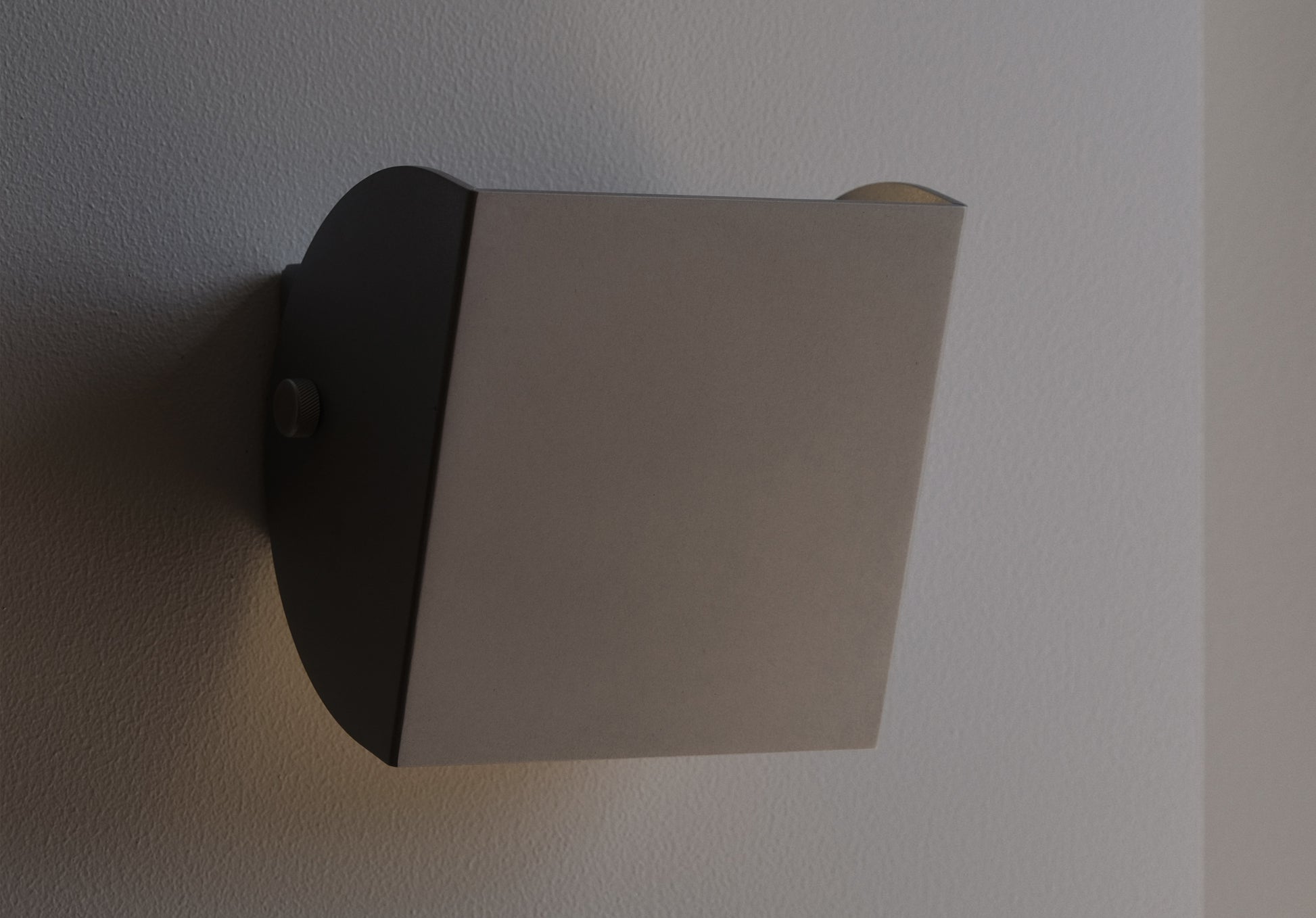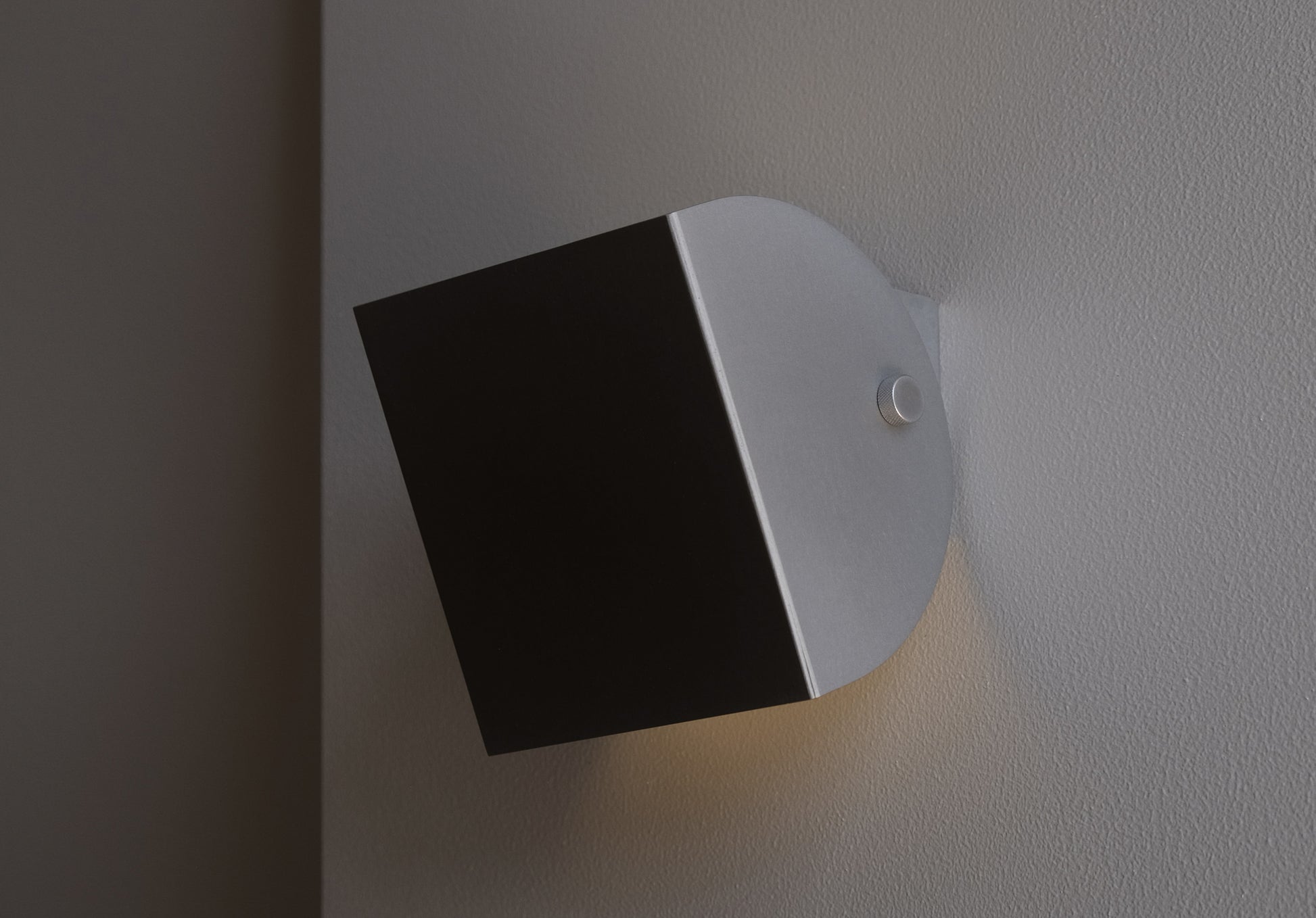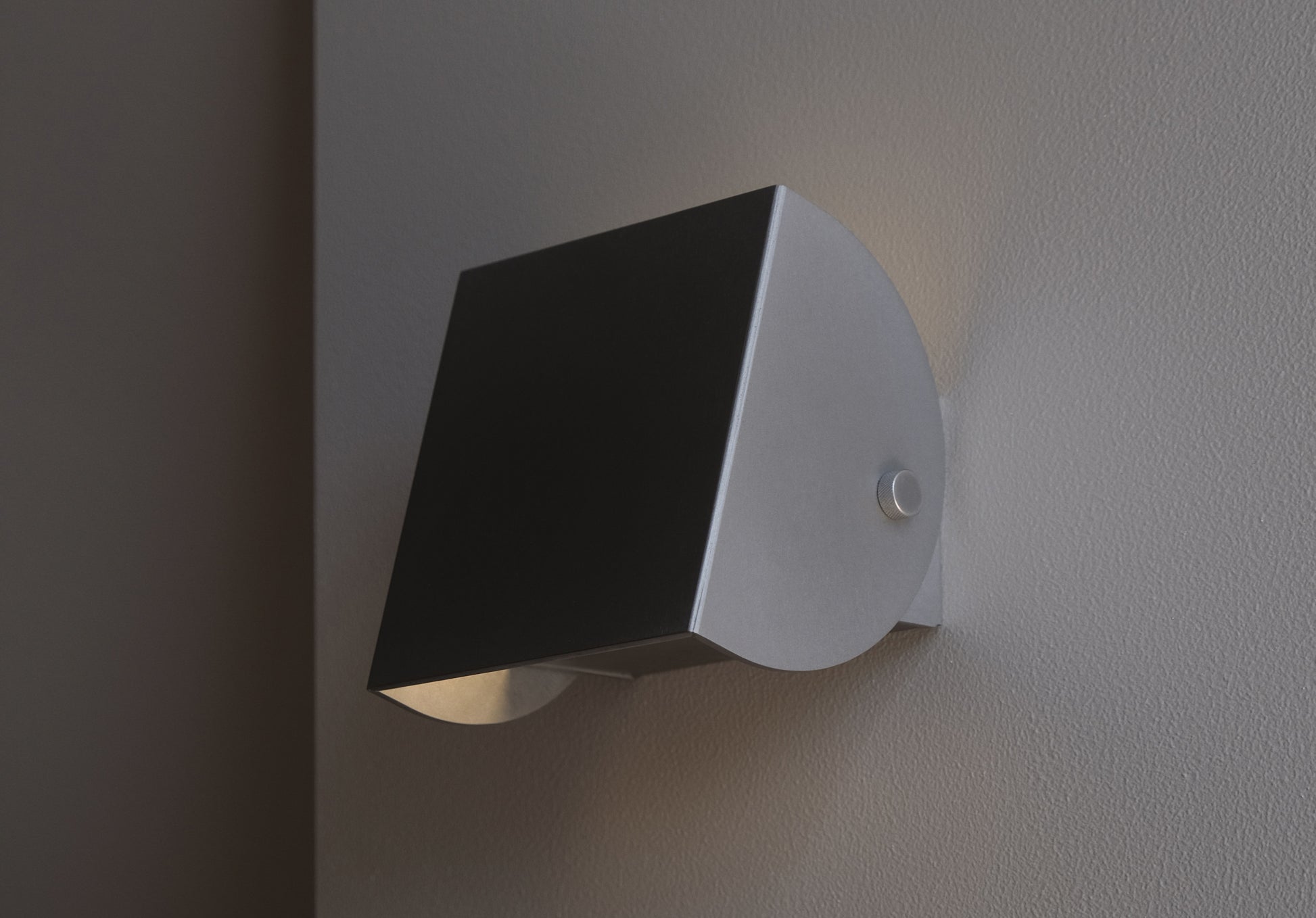 An interactive wall light designed to allow the user to control where its soft glow is cast. The lightweight, hand-buffed, aluminium fascia pivots on gently spun joints, controlling the angle and reflection of its warm light source. An internal routed track allows up to 45 degrees of rotation, while preventing it from ever rotating into the surface upon which it is mounted. The knobs of the pivot hinges are gently knurled, allowing the user to adjust the amount of friction at the light’s axis.