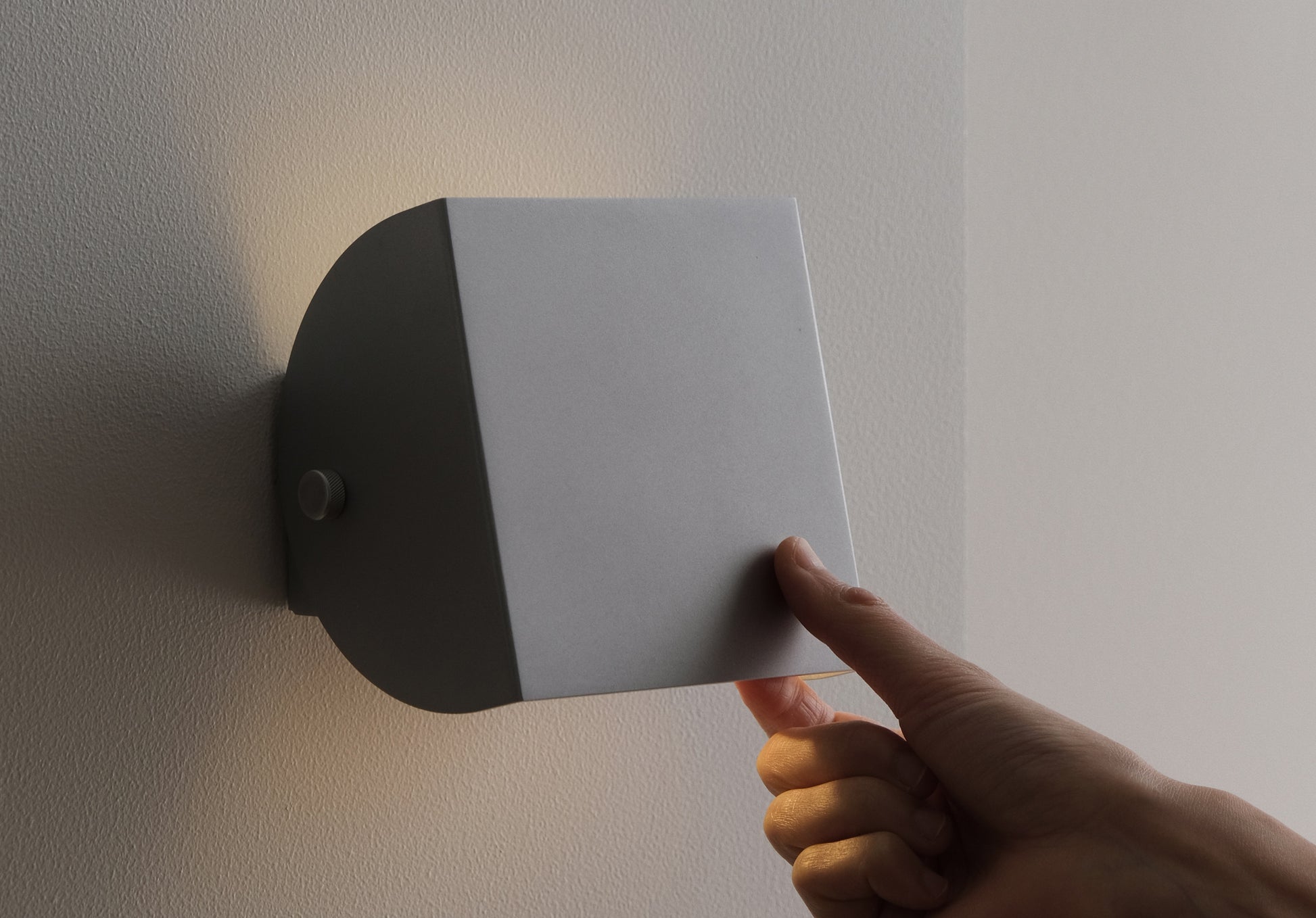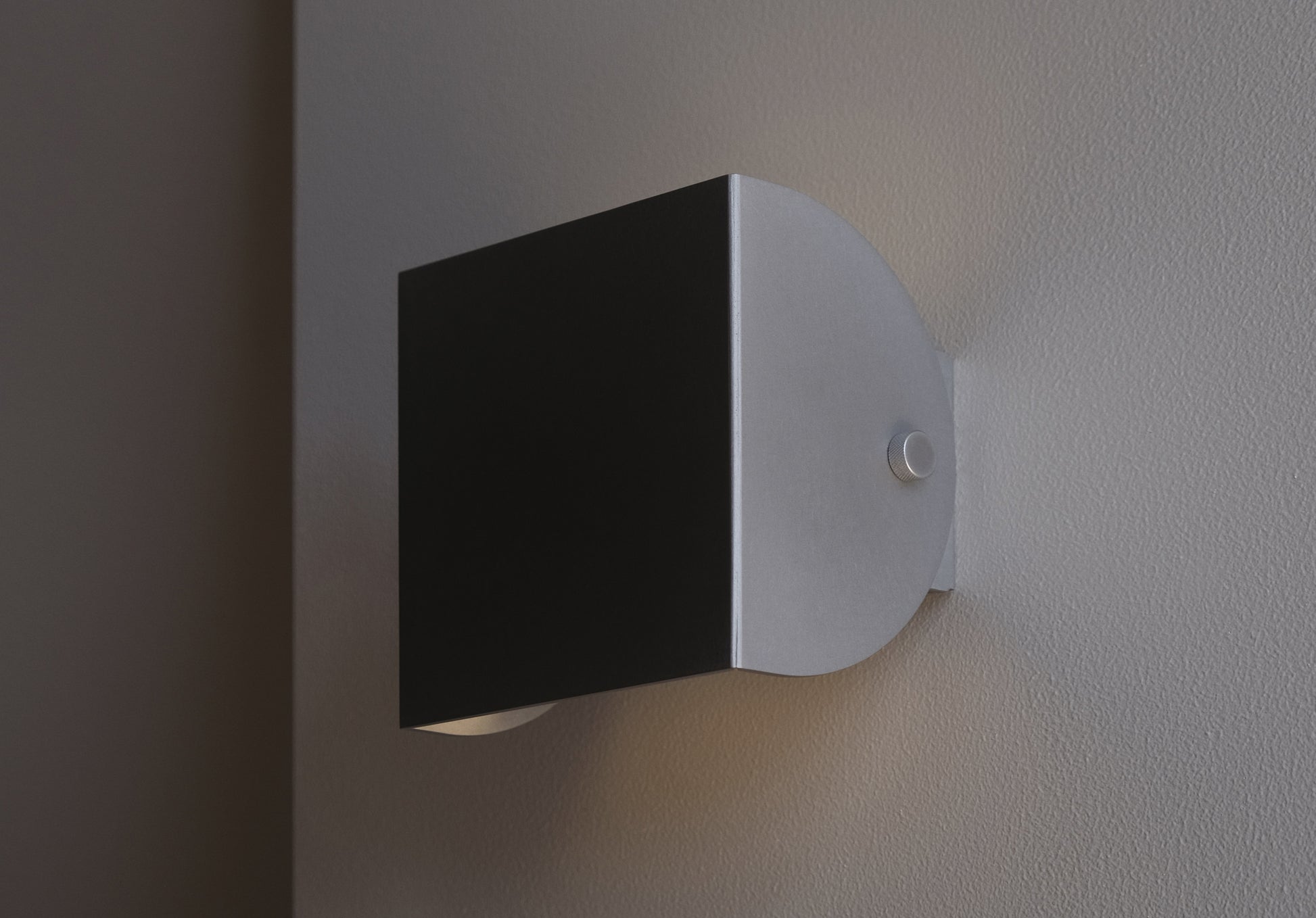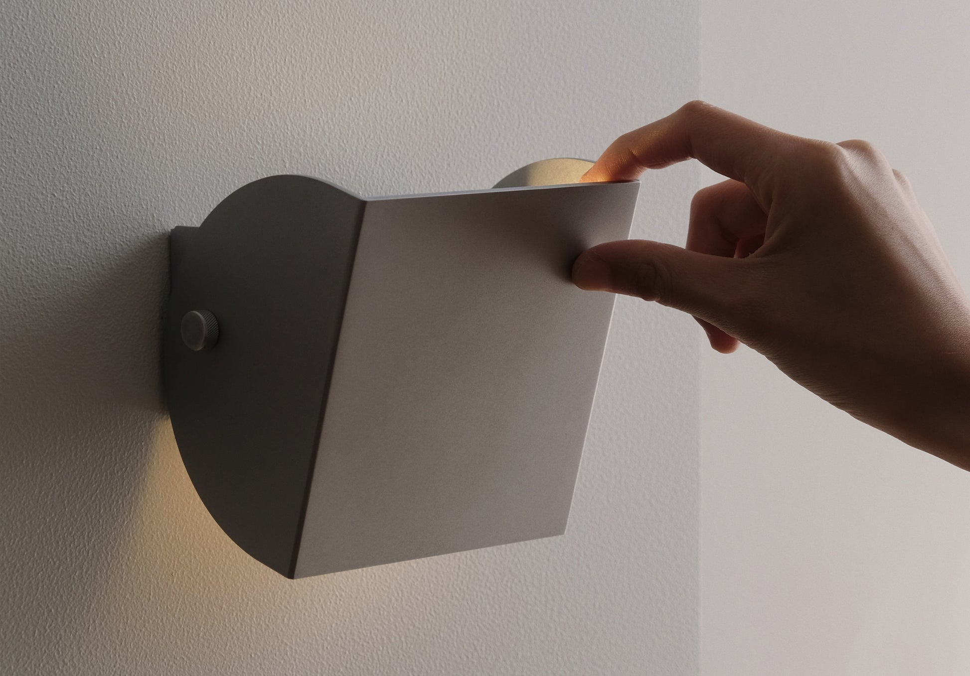 An interactive wall light designed to allow the user to control where its soft glow is cast. The lightweight, hand-buffed, aluminium fascia pivots on gently spun joints, controlling the angle and reflection of its warm light source. An internal routed track allows up to 45 degrees of rotation, while preventing it from ever rotating into the surface upon which it is mounted. The knobs of the pivot hinges are gently knurled, allowing the user to adjust the amount of friction at the light’s axis.